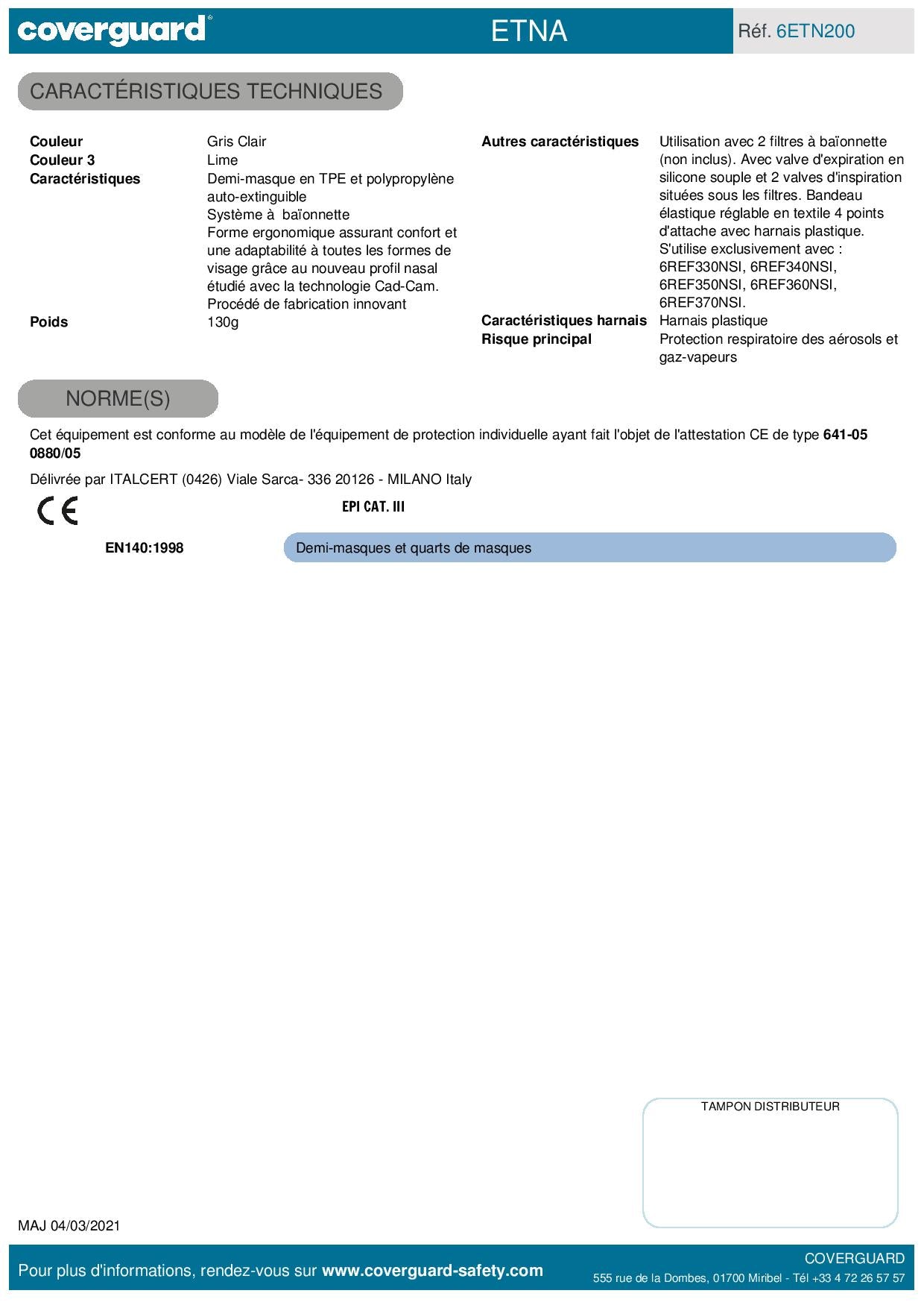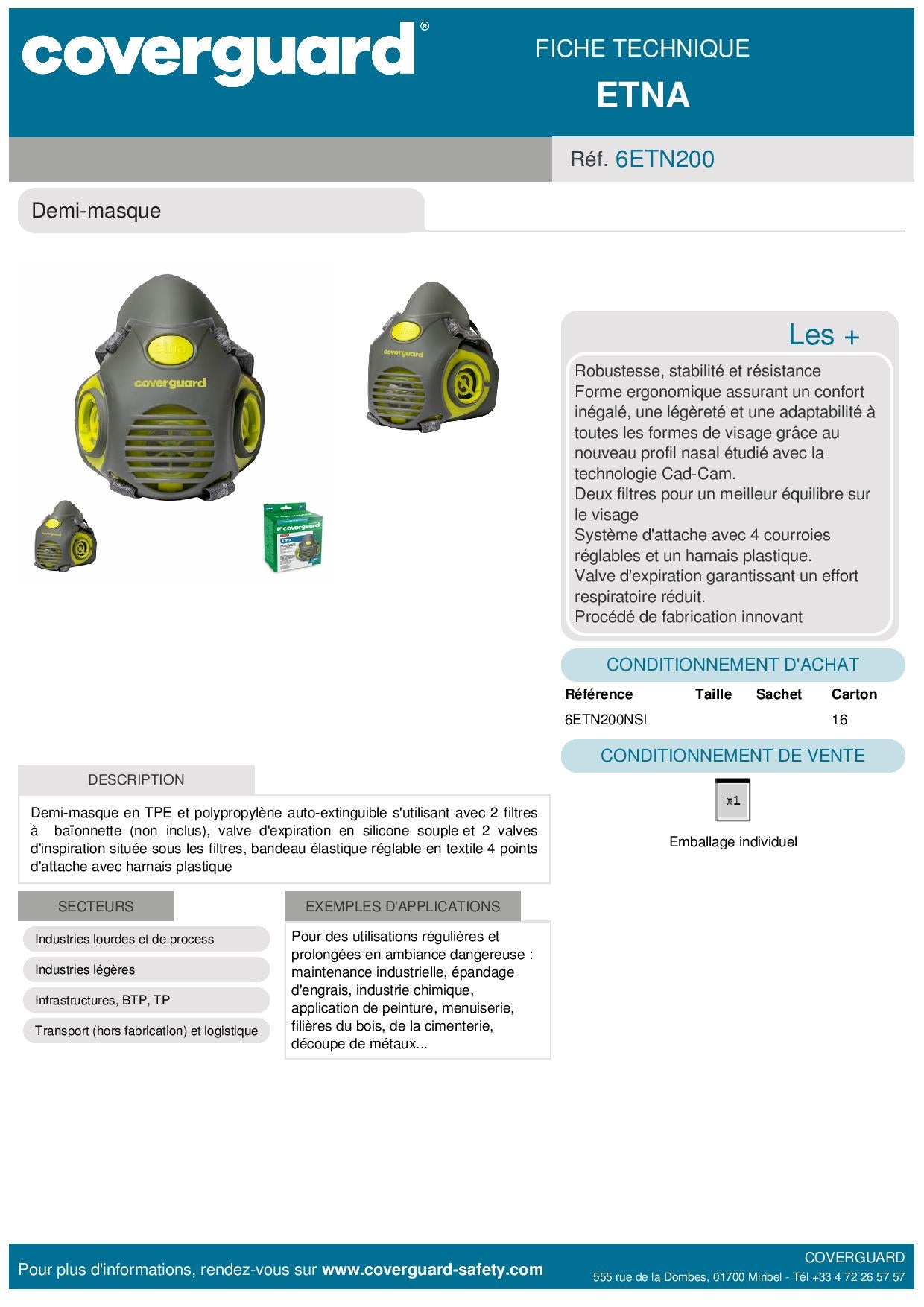 Demi-masque réutilisable ETNA. Fabriqué en TPE et polypropylène auto-extinguible s'utilisant avec 2 filtres à baïonnette (non inclus), valve d'expiration en silicone souple et 2 valves d'inspiration située sous les filtres, bandeau élastique réglable en textile 4 points d'attache avec harnais plastique