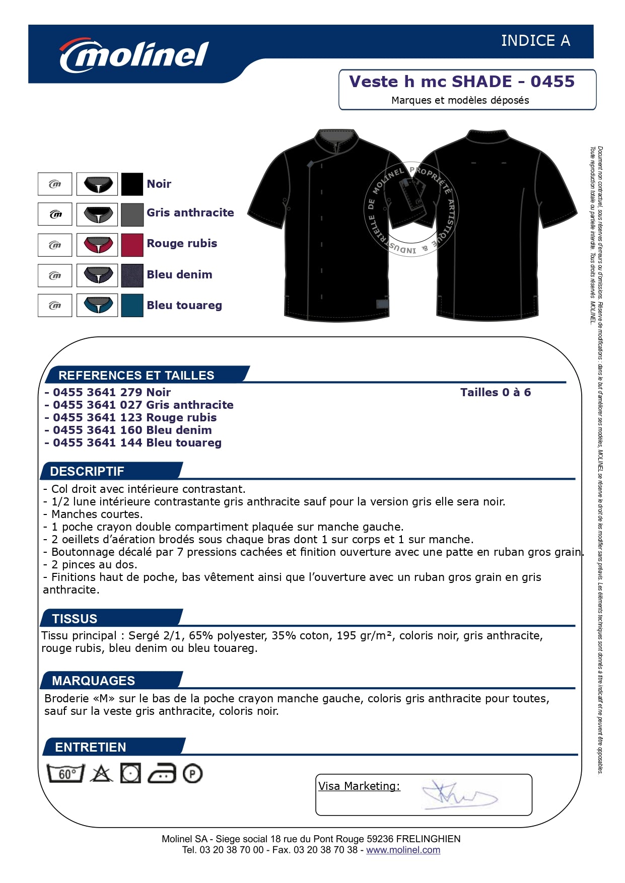 Col droit avec intérieure contrastant. - 1/2 lune intérieure contrastante gris anthracite sauf pour la version gris elle sera noir. - Manches courtes. - 1 poche crayon double compartiment plaquée sur manche gauche. - 2 oeillets d’aération brodés sous chaque bras dont 1 sur corps et 1 sur manche. - Boutonnage décalé par 7 pressions cachées et fi nition ouverture avec une patte en ruban gros grain. - 2 pinces au dos. - Finitions haut de poche, bas vêtement ainsi que l’ouverture avec un ruban gros grain en gris anthracite.